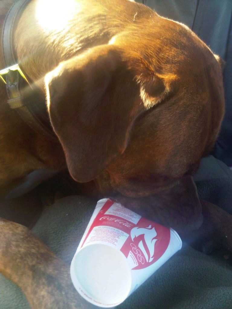Indoors he was a mostly a superstar he never chewed (except ate one of my Crocs but I think he did me a favour stopping me committing the ulitimate fashion crime and a tv remote) he didn’t steal food as rule you could leave something right in front of him and he never touched it until you said he could, but there was that one time when we had spent hours making sausages from scratch they were all beautifully finished and linked in batches to be cooked or frozen and I don’t know what got into him but they were left unattended long enough for him to eat the bloody lot (about 1.5kilos. He would sit and speak on command for treats and was always so gentle when he took them, it was pretty much the only bit of discipline he had. The car was his and food rules didn’t apply to him there no matter how hard you tried to conceal your shopping if you stepped out of the car all meat products were gone in seconds, he also took to drinking Costa coffee if you left any unattended, we watched him on one occasion, he snuck over the front and popped the lid off the cup stuck his fat nose in and lapped up the coffee then took the cup over the back to finish the job properly, it’s amazing he lived as long as he did! We took him on our annual work trip to Cornwall he loved walks on the beach in the afternoons and crashing around a holiday cottage like a herd of elephants upsetting the the neighbours. On the the return journey we stopped in Tiverton for pasties to take home for everyone, that’s 7 giant pasties with various fillings at £4.50 per pasty. We made it nearly all the way home but desperate for a wee made a dash for the services first taking time to build an impenetrable barricade of tool boxes, drills and suitcases over the top of the pasties, we practically sprinted to the loos did what we had to do and jogged back to the car…….too late all that was left was shredded paper bags and a guilty looking dog! His face got him out of most trouble, you could only admire his determination and incredible speed but this story doesn’t end there! I was working two jobs then as I had started up my floristry business so at 03:00 I had got up and Bentley and I headed for Covent Garden flower market. I left him in the van while I shopped for flowers loaded the the boxes and went for breakfast, a big fat greasy fry up the whole thing took around an hour. On returning to the van I knew that something was wrong by the look on B’s face and the fact he was huddle on one seat when I opened the door I had never seen anything like it there was diarrhoea from one end of the cab to the other, on every inch of the seats, it had run down and filled the door pockets, he started paddling around in it and I couldn’t do a bloody thing to stop him dogs are absolutely forbidden out of vehicles he would have got me thrown out. I did what any woman would do in these circumstances I cried, I didn’t know where to start but something had to be done so I got empty boxes from the bins and started scraping the liquid shite off with cardboard paddles and as much loo roll as I could get, I washed my hands until they were raw and then made a horrible mistake of emptying the contents of a bottle of air freshener on the seat fabric. I drove home with my head out one window and Bentleys flappy flannel face hanging out the other trying to suck in fresh air not the stench of diarrhoea now mixed with sickly freesia floral air fresheners (a scent that still makes me gag to this day) so not only did the bastard eat £30.00 worth of pasties he ruined my van no amount of shampooing seats ever got the memory of that day out of my mind! I would like to say that was an isolated incident but it wasn’t there were at least three other explosive situations caused by snacksidents, one when I was trying to get 33 funeral tributes out for a very large travellers funeral, this time he covered practically every square inch of the Discovery interior and you have no idea how many nooks and crannies there are in a car until you fill it with liquid crap. There was an occasion he must have got fed up waiting for his daily Denta stick so he pinched the whole box and ate all 27, they didn’t come out like sticks! Another time he was as least confined to the boot of the range rover by the one dog guard he didn’t dismantle, this was no where near as bad as previous two events but unfortunately Range Rover has installed the CD player at arsehole height so you can work the rest out!