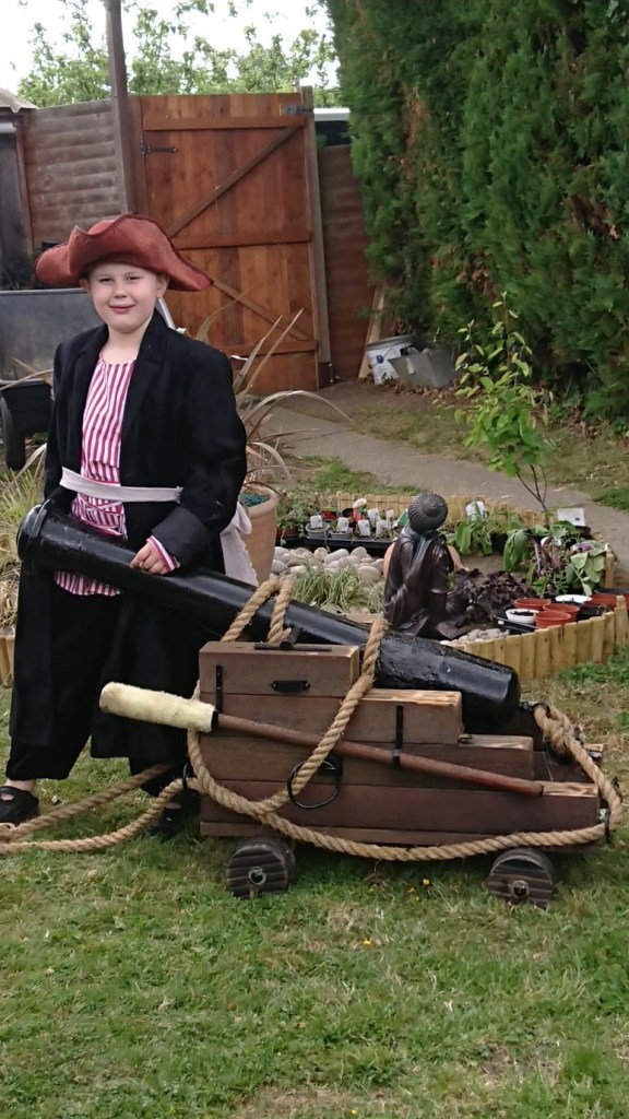 It was Fabians 7th birthday on the 24th and the poor little man had planned a big pirate party for a year now but due to lockdown he had to make do with us motley crew and visits from the scallywags that’s are my parents, his Aunty Janice and Aunty Aga and Roxy made a very brief stop. I worked tirelessly to turn a bit of the garden into Tortuga, luckily my “that will come in handy one day” stuff again came in handy so we had treasure chests, wooden barrels and an assortment of muskets and swords available, my mum made a stack of bandanas and dad made a load of eye patches from plant pots and being the brilliant sports they are they got stuck into their roles with great enthusiasm (maybe more than would be considered “normal”). We did treasure hunts, had a few sea shanties to sing to (thank Christ that was short lived) we had a decent spread of party food as chosen by Fabian, I must confess my food snob title is under threat after I discovered I love Bernard Matthews Turkey dinosaurs, I don’t know if there’s a support group I can join to get me over this?? Anyway all in all Fabian had a great day but by far his best thing was the canon my Dad made for him, complete with stage charges rigged by my friend so he could fire it (it only took five goes before we managed to record a 30 second video clip)