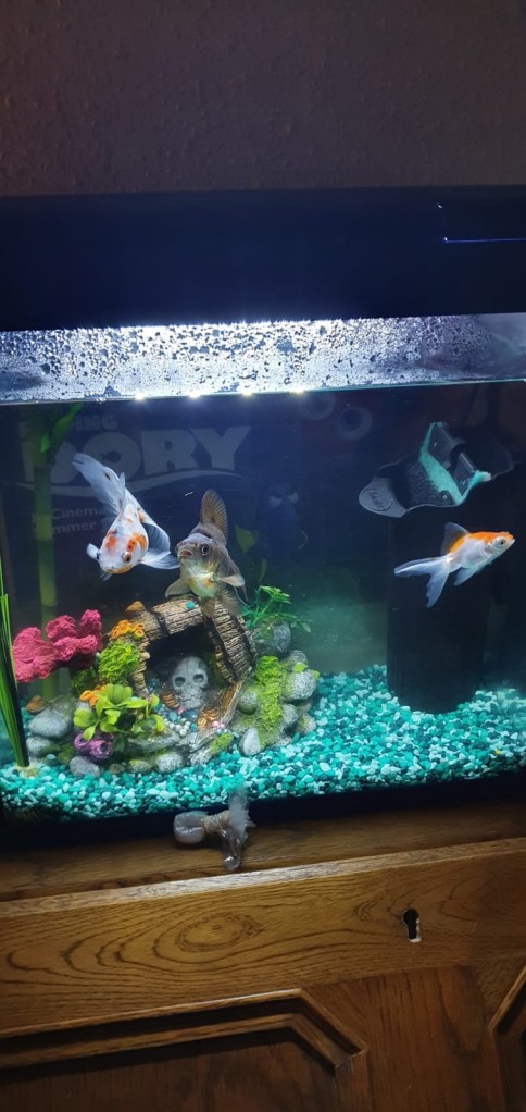 I don’t think I mentioned that Fabian asked for goldfish for his bedroom as a birthday present, we had a spare tank so this was supposed to be an added bonus on top of his other bits but!!!! We had set the tank up ready for said fish and on the afternoon of his birthday I drove him up to a local Aquatic centre to select said fish. As we walked in my phone rang, it was Millie saying “while you are there can you get a new tank this one is cracked” there was a lot of f’ing and Jeffing from me as Fabe doesn’t take change well and now he can’t have his fish. So while I’m selecting the new tank Fabian has found the fish of his dreams but the skinny weasel in the shop wouldn’t sell us the fish because we were buying a new tank, I tried to explain the water had been conditioned and I just had to transfer it from the cracked tank to the new one he was having none of it, so I said can we pay for the fish (they only had 5 left and a lot of empty tanks) and I would pick them up in a week……..NO grrrr ffs so left £120 lighter with a tank, no fish and an upset child! Four days later we took a drive out to Rolvenden to World of Water now they had loads and loads of tanks but only 1 fish left, it was a Beauty but not they”crazy eye” type Fabe had his heart set on so the following day we went to Polhill garden centre the one and only time I’ve queued for what seemed an eternity but I knew they have a great fish dept so felt the queuing would be worth it, was it fuck they had about 10 goldfish and again no “crazy eyed” Moors so another wasted journey there were a few other trips and nothing so against all my misplaced principles we went back to where started and thankfully the original fish he wanted were still there so home we went with Barbosa, Jack and Gibbs came to their forever home with us……turns out their forever wasn’t that long!!! So I showed him to count out the pellets into his hand, I explained their stomach is roughly the same size as their eyes so they only need about 4-5 pellets each and I made sure that’s what he did for the first few days. So when I checked a few days later and the water was thick and brown I was speechless, I fished around in murky gloom and found Barbosa and Jack had gone to Davey Jones locket but Gibbs was hanging in in there! Fast forward to today and we now have new clean tested water and are ready for new fish this leads us to stop At Nottcut’s, they had a better selection but not a Crazy Eye to be seen but he did find some fancy ones he liked the fishy fellow hooked them out and took them to the checkout “ £37.00 please” “but there’s two fish in there not real gold I might add” I paid reluctantly and have warned if he tips the whole sodding pot in again I will cook those fish and he will eat them as they cost more per lb than turbot!!