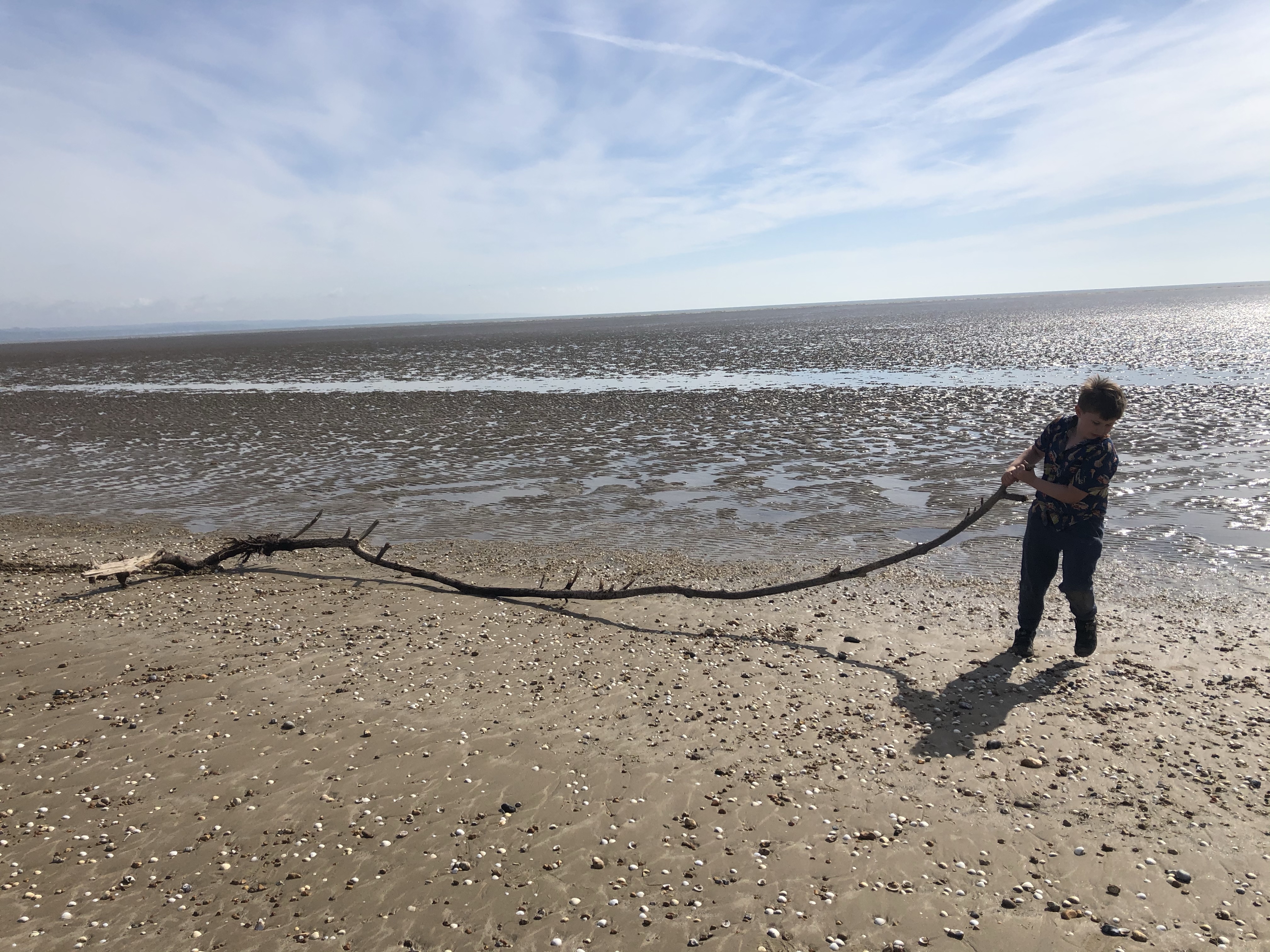 We arrived at Littlestone, parked easily next to the beach it was only a very short walk up a pebble path through the dunes and we were met with the glorious site of miles of sandy beach, the tide was so far out you could barely see the sea just the sun glimmering on the wet sand it felt like the first proper freedom we’d had in months! Fabian needed no asking he was off like a rocket running for all he was worth, Millie being the sultry teenager opted to walk the tide line on the pebbly bar between the dunes and sand collecting shells and anything else interesting (she’s a real chip off the old block) I caught up with Fabe who was by then digging his way to Australia using a very large shell as a spade, it was an impressive hole for a small boy with a clam shell! I had been worried everyone would have the same idea and we would be forced to leave by crowds of people, the media is heaving with pictures of packed beaches and my social media sites are full of self righteous people passing judgement on all who dare set foot on the shore but there wasn’t another soul around so for at least an hour we walked and gathered shells until Fabian found what he considered a stick but most would call a tree, he dragged the bloody thing around with utter determination, your average Labrador would have been very impressed. We walked until the dots in the distance started to form the unmistakable shape of people and more importantly Fabian started to whinge about food as I did promise I’d find somewhere for breakfast so before we went back to the car we did our five piece litter pick, we have a rule we each have to gather at least 5 pieces of plastic before we leave a beach, sadly we’ve never found a beach where this wasn’t possible and this one was a particularly bad one, there were loads of sheets of polythene, fishing line and a foil balloon with a long poly string just the sort of thing wildlife gets tangled in, if everyone just took the time do that then maybe it would make a small difference.