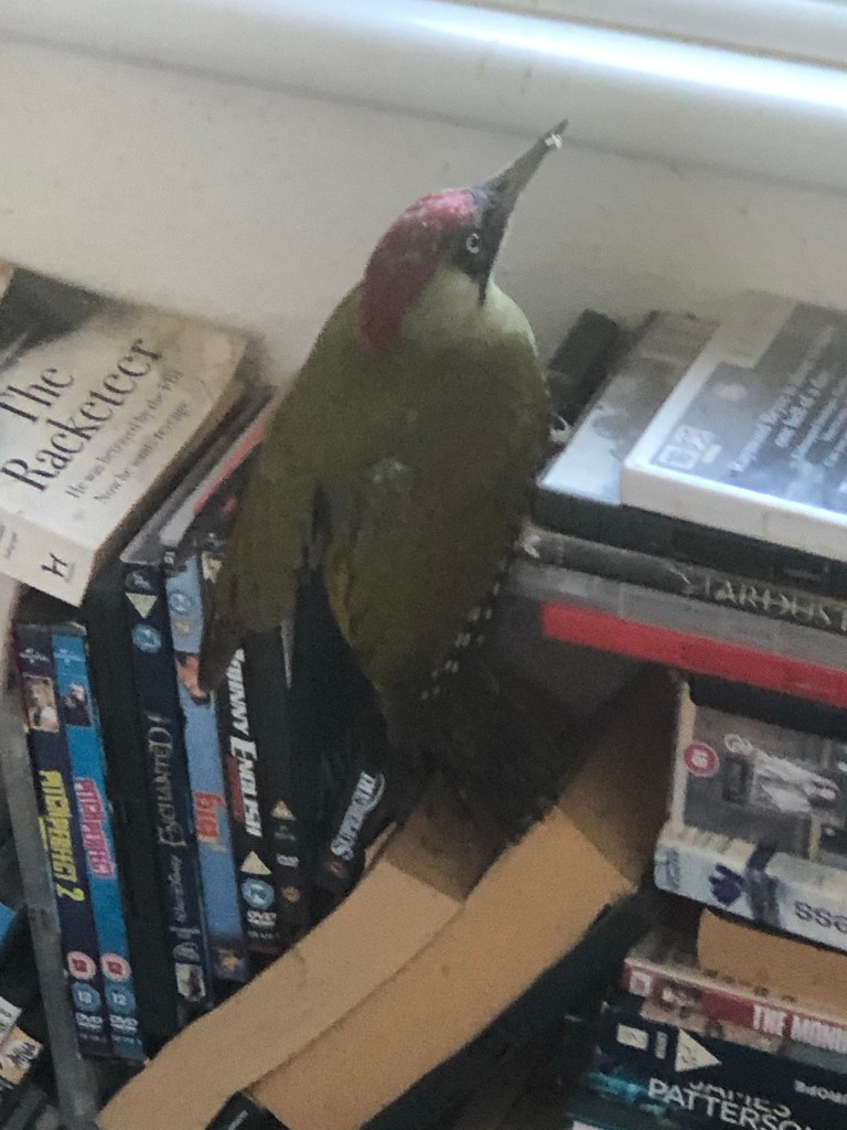 After actually sleeping a whole night without a pet with the zoomies running over me or my minuscule bladder dragging me out of bed in the wee hours I was woken by an almighty calamity on the stairs I jumped out of bed just had time to drag a whopper pair of granny pants on before the source of the commotion tumbled into the bedroom…..wtf was my instant reaction! It took a few seconds for my eyes and brain to unravel the sight before me but slowly the pieces fell into place there was Golly and Baggy circling a really pissed off green woodpecker! I leapt into action booting the furry duo onto the landing then stood face to face with Woody neither of us knew what to do or which way to jump, he chose the next move and flew straight at me I shrieked he squawked and narrowly missed my overly ample chest crashed into the mirror turned around and came back at me I ducked he flew out onto the landing where the two cats sat laughing at how funny they were for bringing in an f ing woodpecker getting it up the stairs and then letting the bastard go! With a tit over each shoulder I pursued the pecker to the office where it made its stand under a chair, if you ever find yourself in this situation I strongly advise you to leave the room and shut the door and wait until it’s dead so you can throw it out but me being me tried to catch it!! From a safe distance woodpeckers are beautiful sleek birds that make fun sounds and are crap at flying when you are semi naked woodpecker wrestling on the carpet they are pure evil opponents with the biggest sharpest beak you can imagine, they are winged savages that only want to peck your eyes out and I’m amazed I still have all my fingers, also did you know they stamp their feet in anger, proper thumping them to warn you off. So the Sumo vs Woody match went in his favour but we weren’t done. After a few laps of the office we were back on the landing, he crashed into the window and landed on the ancient dvd pile on the ledge regained its strength before coming right at my head and veered off into the bedroom for another round of whacky races this time I was jumping on the bed trying to get it off the lampshade. After the green ninja crashed into the window for the umpteenth time I thought about what I was trying to accomplish a little more rationally so opened all the windows upstairs and set about herding it towards one, we did another complete lap of the upstairs before I trapped it in the bathroom we re-enacted an Alfred Hitchcock scene before my towel flapping finally corralled it to the window where he flew to freedom out across the fields into the distance with so much as thanks or a backwards glance!